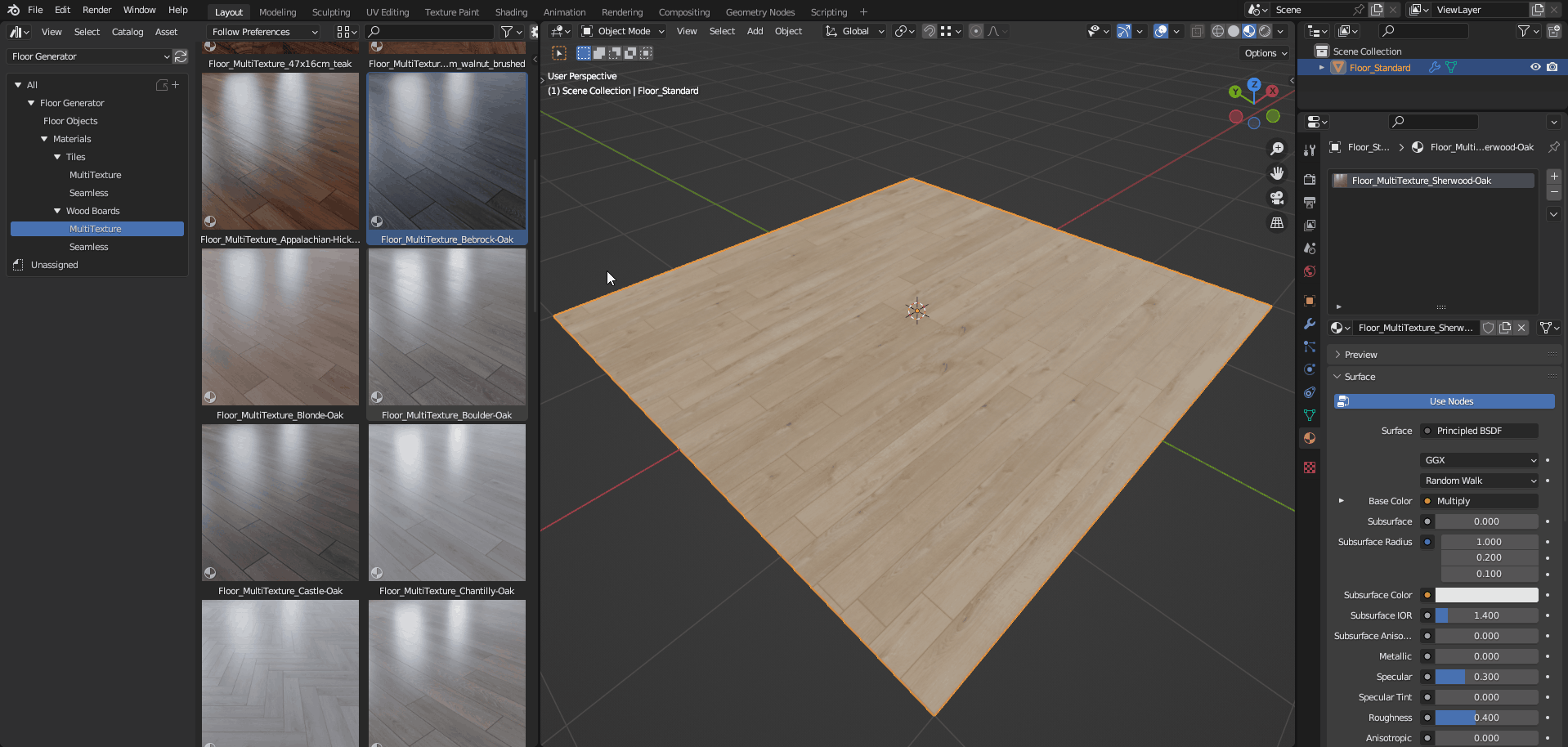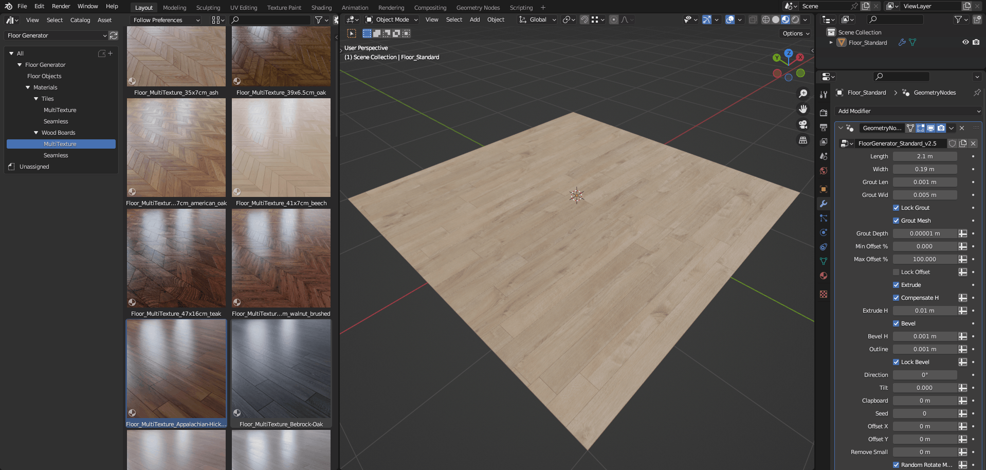 Material Library is also an **Asset Browser** ready library, so you can just unzip Materials Pack file and [add it as an Asset Library](https://docs.blender.org/manual/en/latest/editors/preferences/file_paths.html#asset-libraries) to Blender. So as another option you can add materials to your flooring from the Asset Library.
