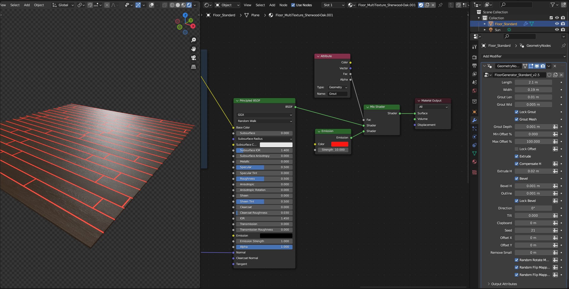 Use *"Grout" Attribute* Fac output when you need custom Grout shader. In this example Grout has Emission shader.