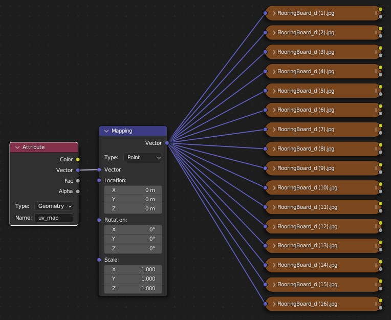 Now it is necessary to link an [Attribute Node](https://docs.blender.org/manual/en/latest/render/shader_nodes/input/attribute.html) to the Mapping Node Vector input. **Attribute Name** should be "*uv\_map*".