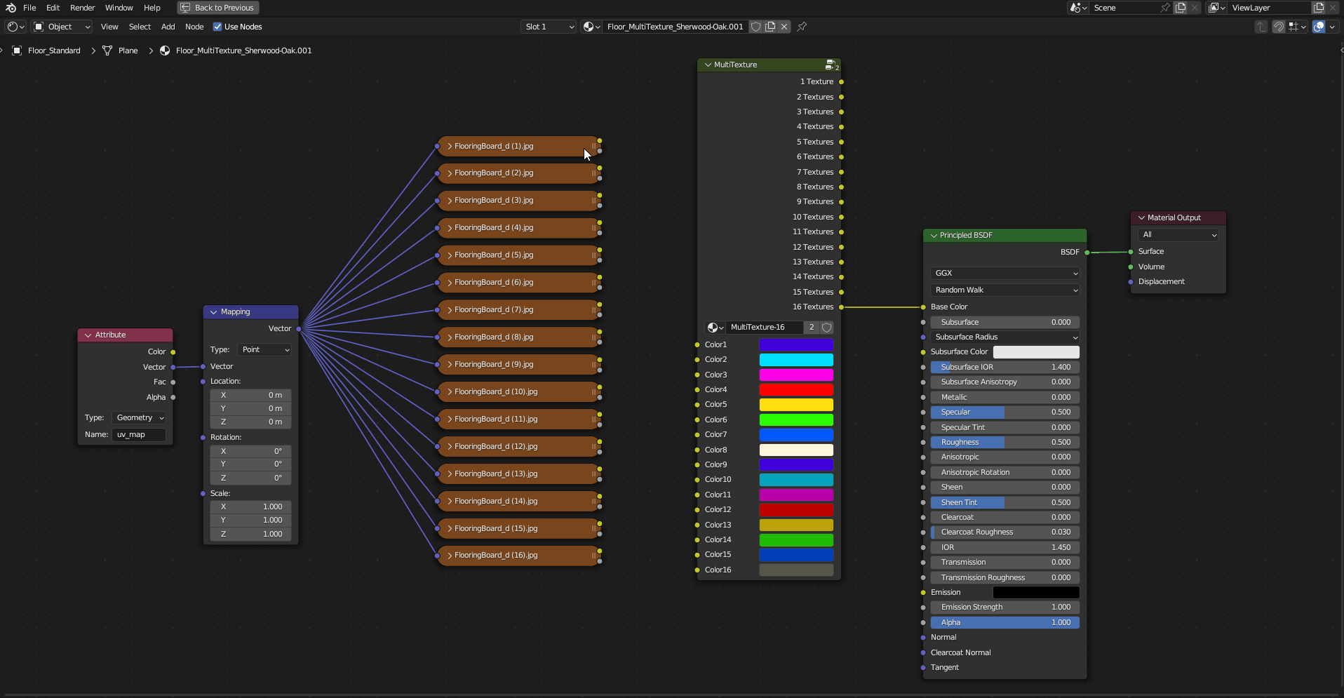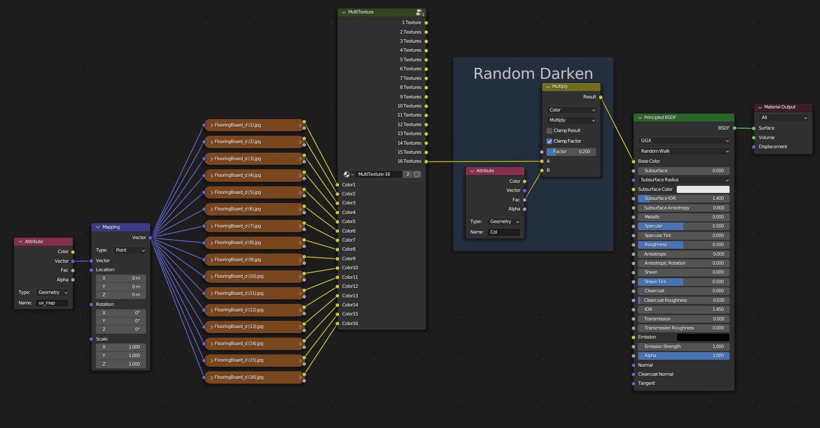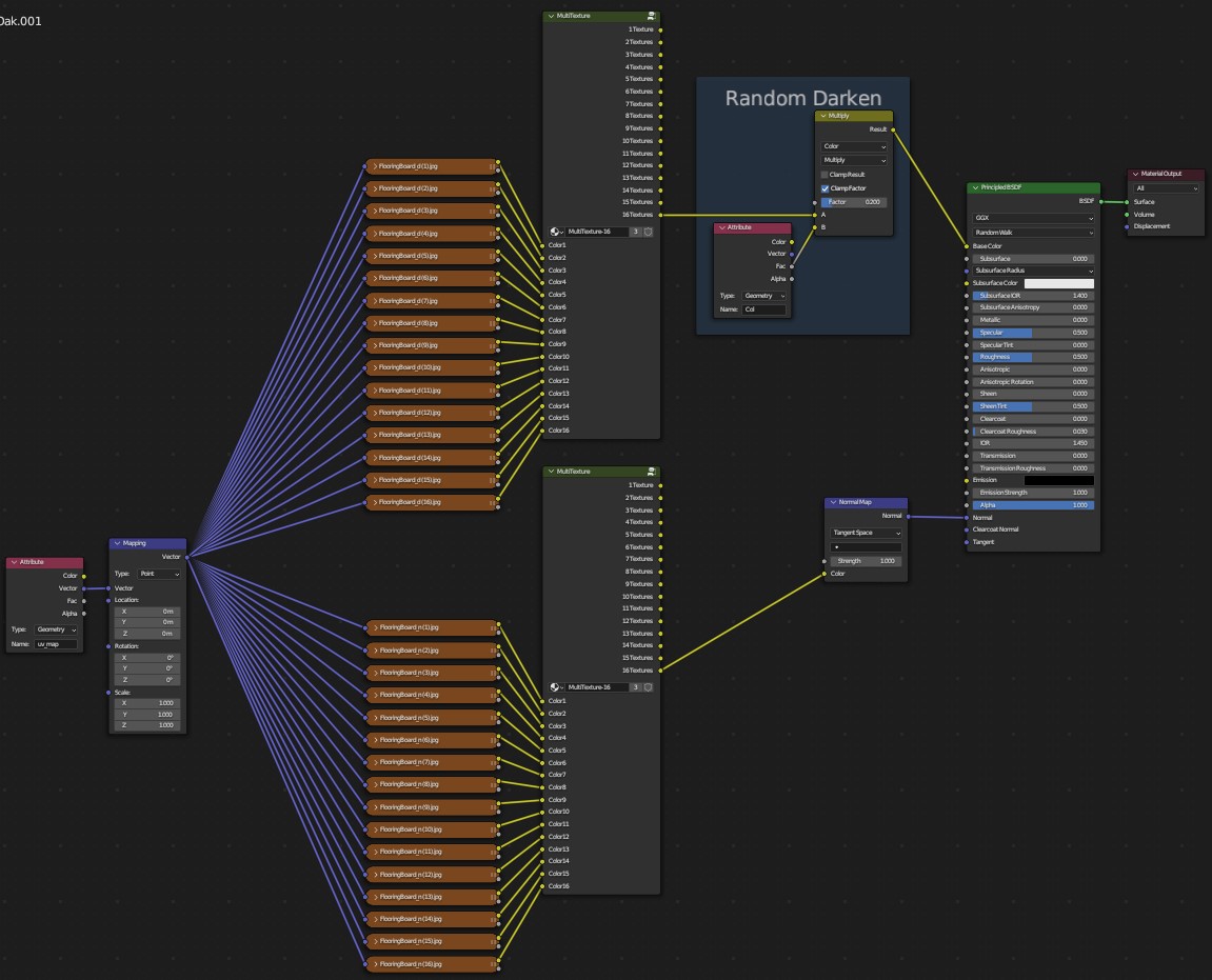 **MultiTexture** is a shader Node which was developed exclusively for [Floor Generator](https://blendermarket.com/products/floor-generator). It allows to distribute randomly up to 16 textures on every board/tile.