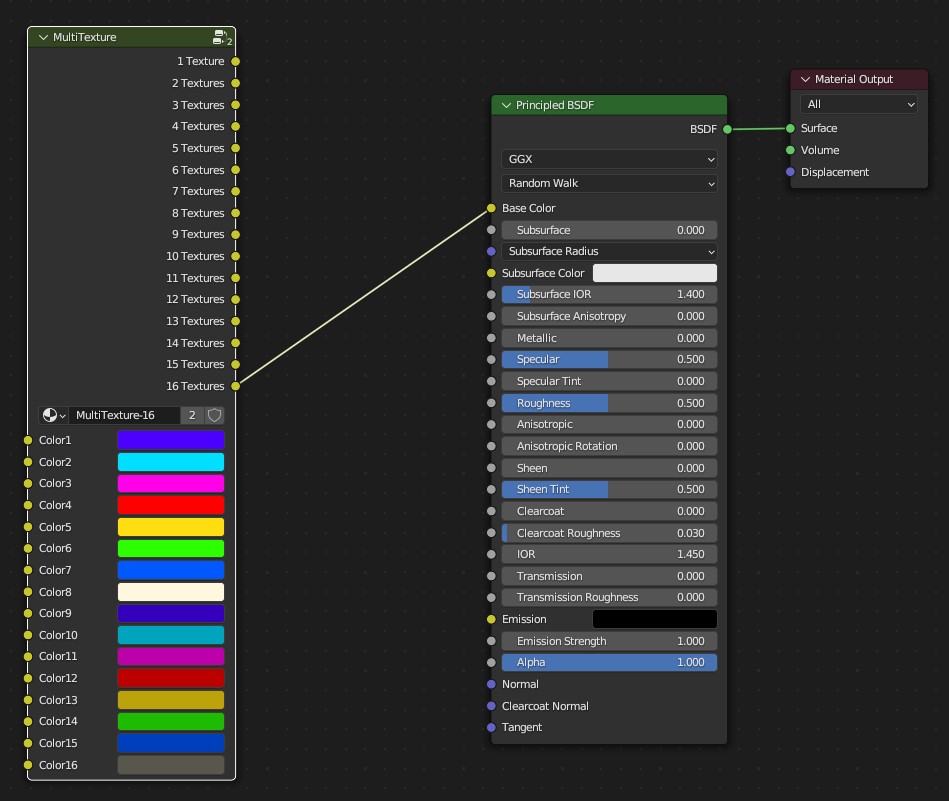 Connect all textures to the inputs of the **MultiTexture** Node. Use [Lazy Connect](https://docs.blender.org/manual/en/latest/addons/node/node_wrangler.html#lazy-connect) (<mark style="color:red;">`Alt-RMB`</mark>-drag) to speed up the process. It is OK if some inputs of the MultiTexture are empty, just use then the correct output.