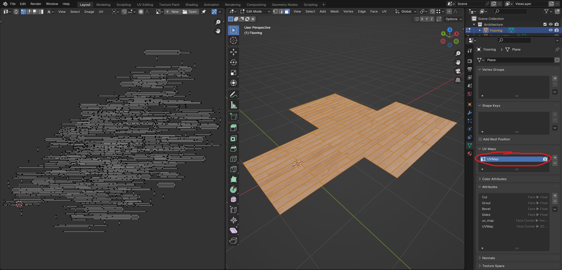 Now in the UV Maps tab - **UVMap** layer appeared. On the left part of the image below it is visible the UV mapping of each board.